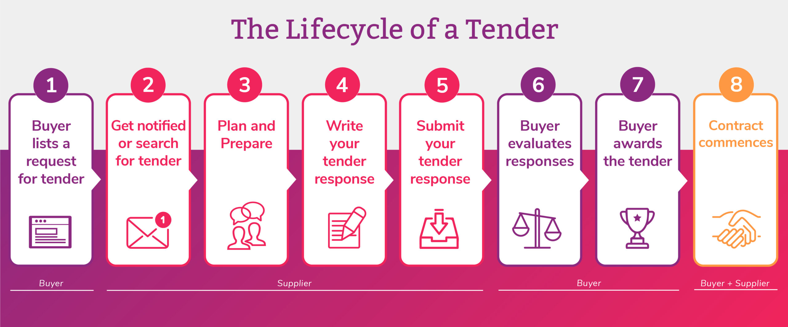 So below is a handy diagram of the tendering process, with an explanation of each step, including how our services support both Buyers and Suppliers at each stage.