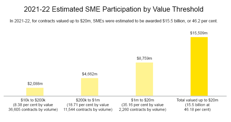 In 2021-22, the Australian Government awarded SMEs an estimated 46.2% of contracts valued up to $20 million, worth a total of $15.5 billion.