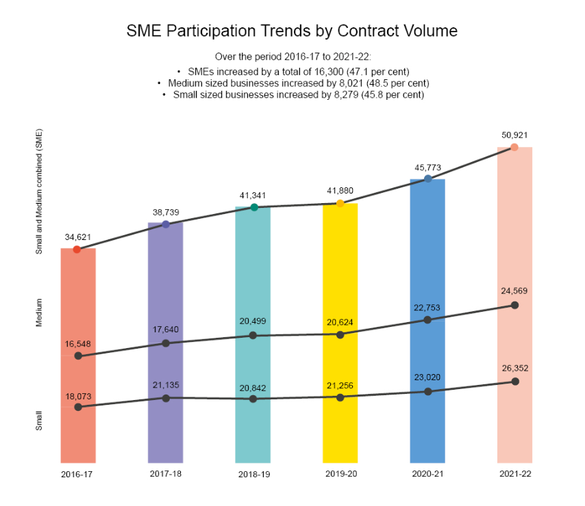 The Australian Government has seen a year-on-year rise in SME participation in Commonwealth procurement over a six-year period. In 2016-17, it awarded 34,621 contracts to SMEs, while in 2021-22, this figure had risen by 47.1% to 50,921 contracts.